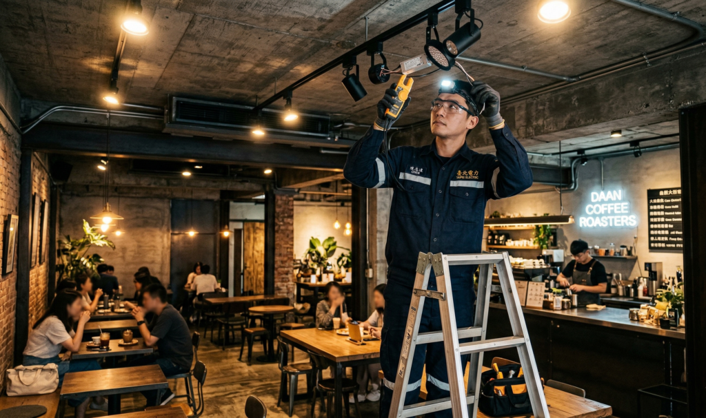 目標關鍵字: 軌道燈閃爍、軌道燈嗡嗡聲、變壓器故障、商業照明維修、LED燈狂閃、台北大安區水電